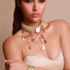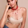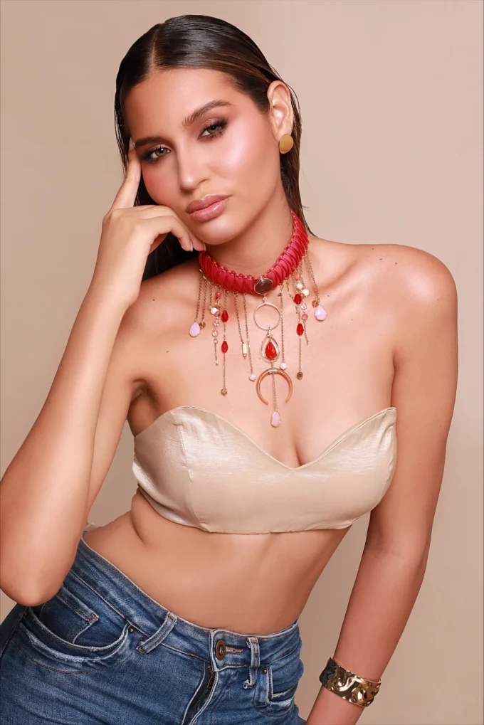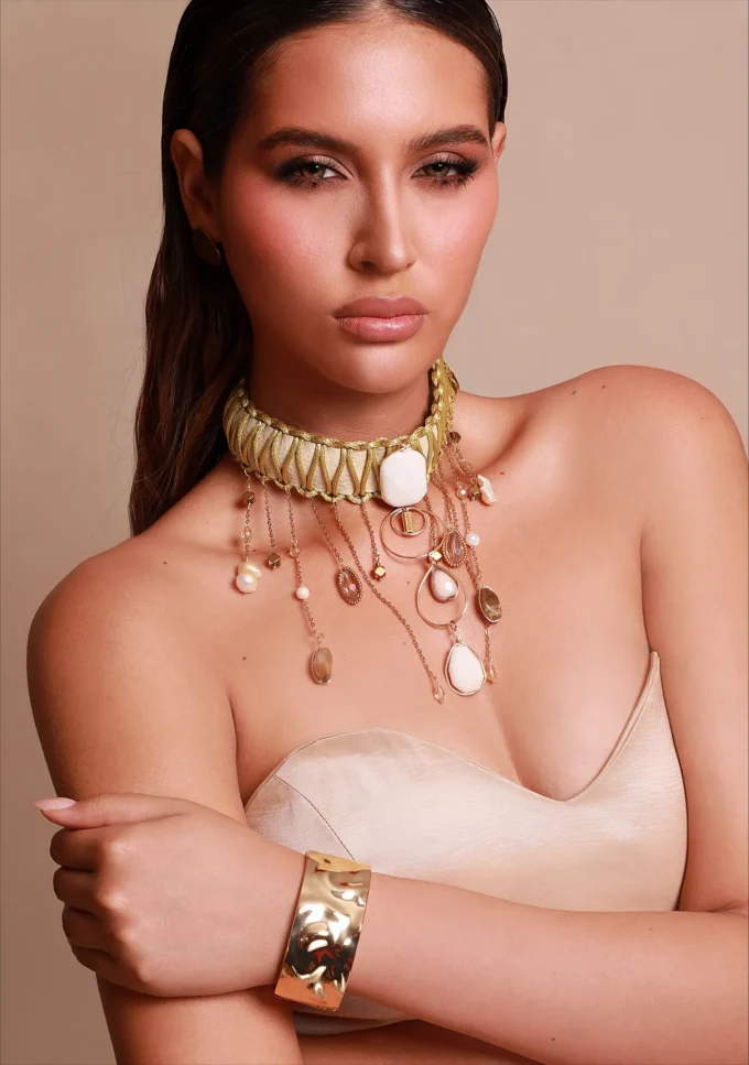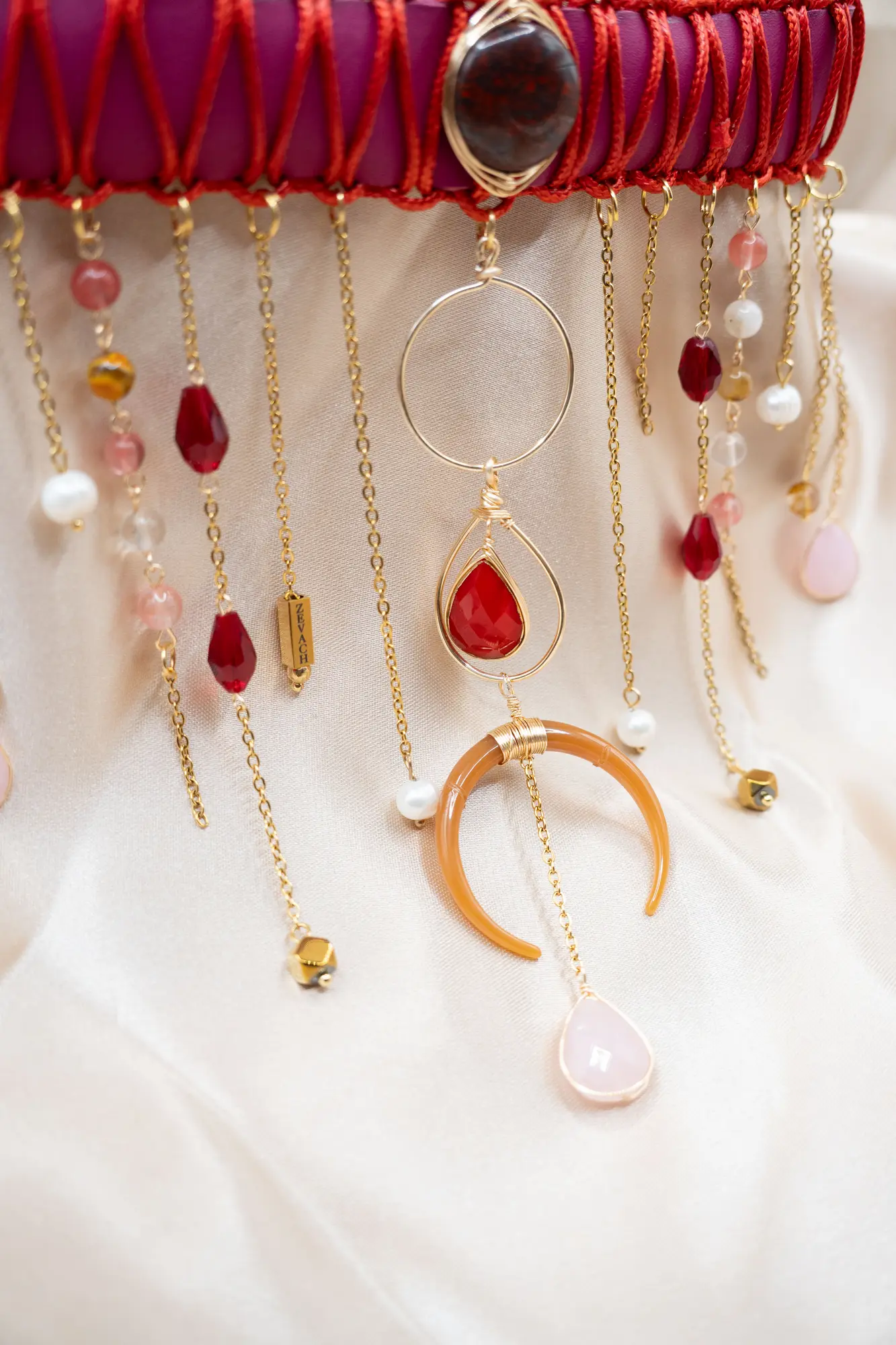 La GARGANTILLA VALIENTE está hecha de piel tejida en macramé con con cascada en cadena de acero cristales y piedras naturales y aretes en acero inoxidable. Una pieza que nos recuerda la fuerza femenina de perseguir nuestros sueños.